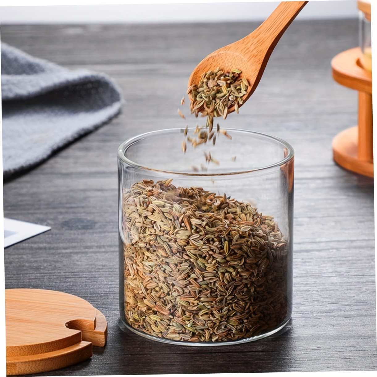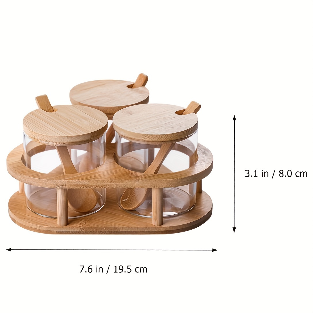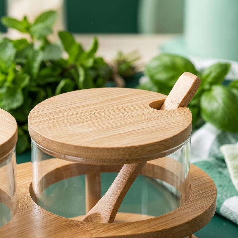 — Material: Vidrio de grado alimenticio transparente — Tapas, cucharas y soporte en bambú natural