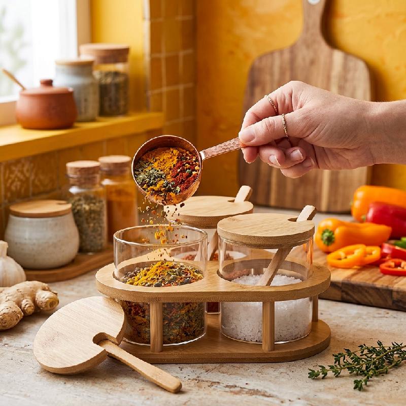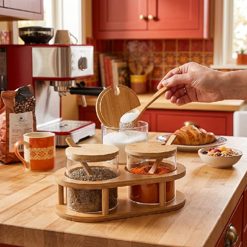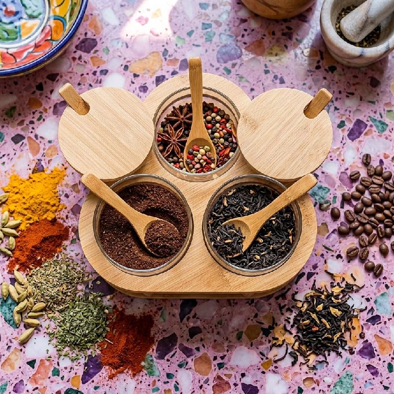 — Nombre: Set Especiero de Vidrio y Bambú — 3 frascos + 3 tapas + 3 cucharas + 1 base organizadora