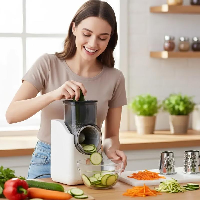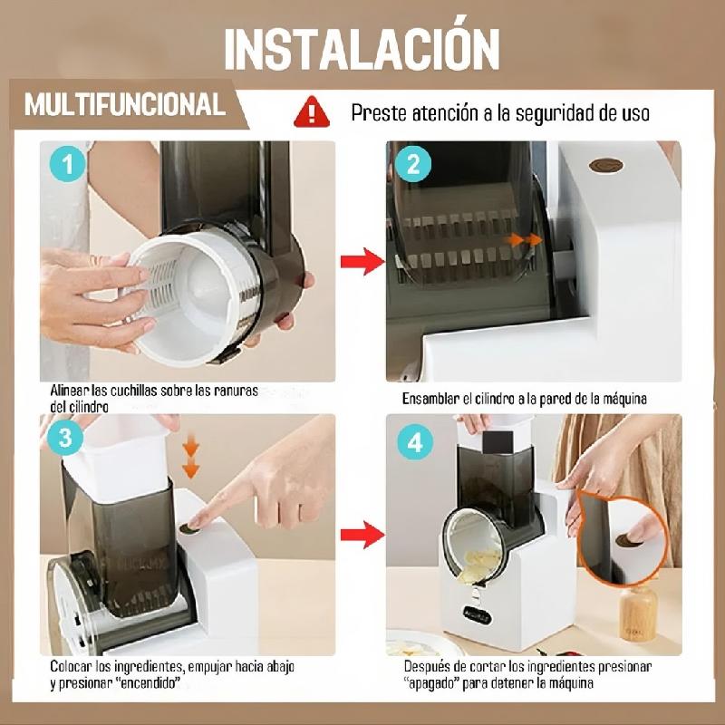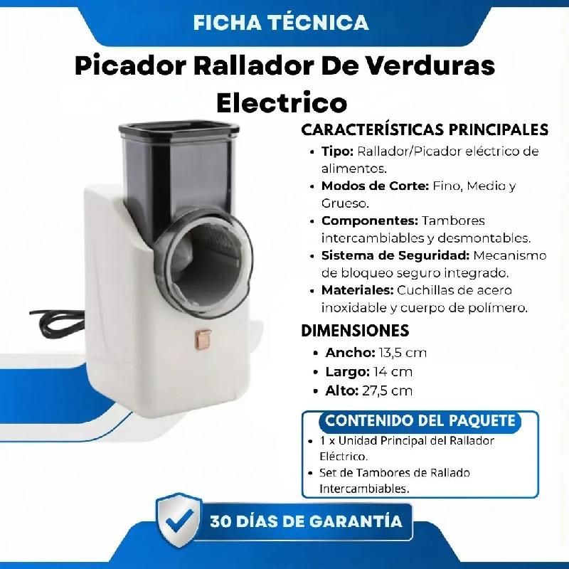 Operación Potente y Eficiente: Motor de alto rendimiento que ralla y pica alimentos rápidamente sin esfuerzo manual.