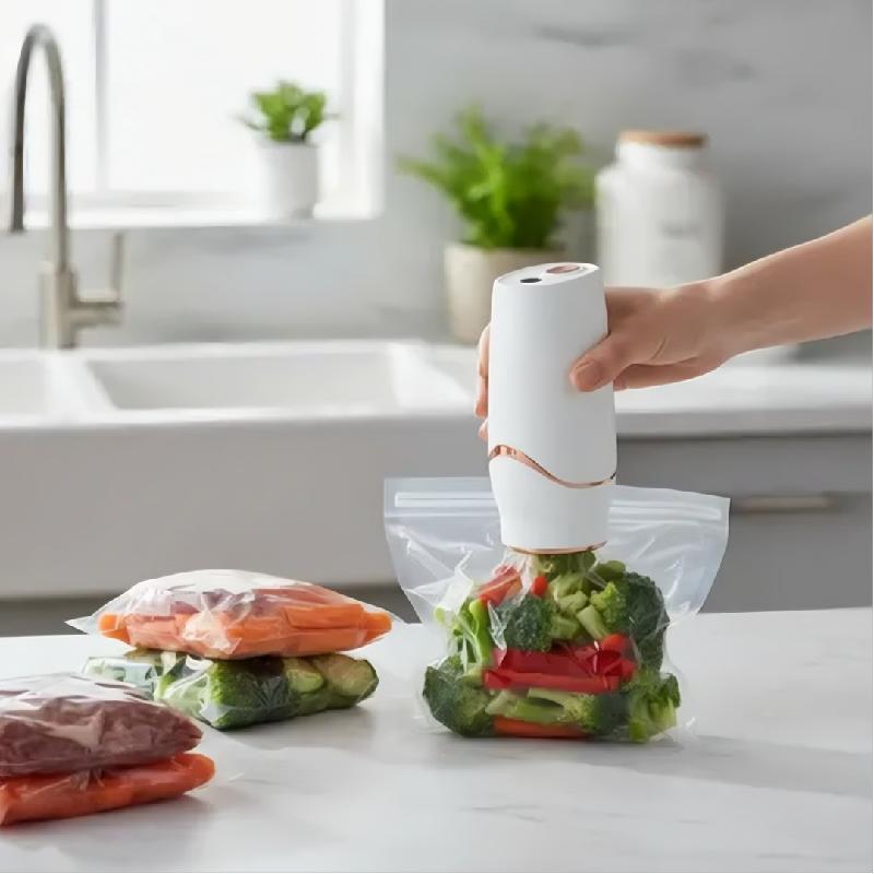 Ahorro de Espacio y Frescura: Al eliminar el aire de las bolsas, este producto ayuda a conservar los alimentos frescos por más tiempo, evitando el desperdicio. Ideal para quienes buscan maximizar el espacio en la nevera o despensa.