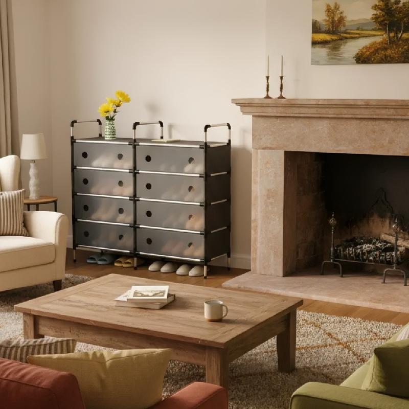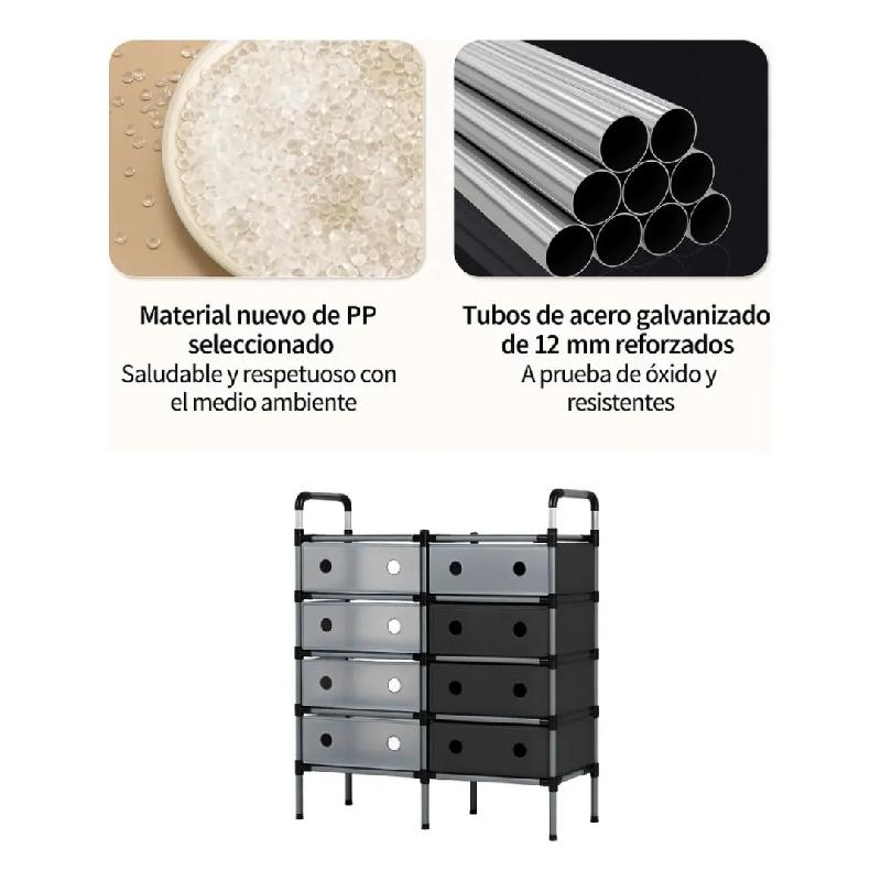 Este práctico organizador cuenta con dos estantes y ocho cajones, permitiendo almacenar hasta 16 pares de zapatos.