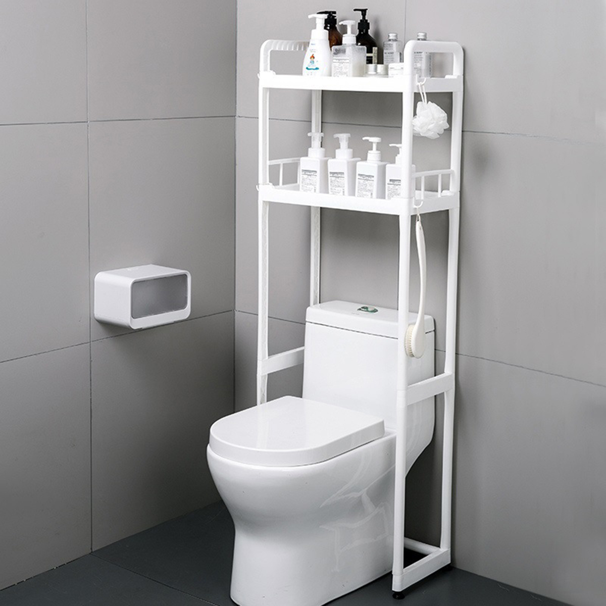 -Organizador de baño multifuncional diseñado para aprovechar el espacio sobre el sanitario o lavadora, manteniendo todo ordenado y accesible